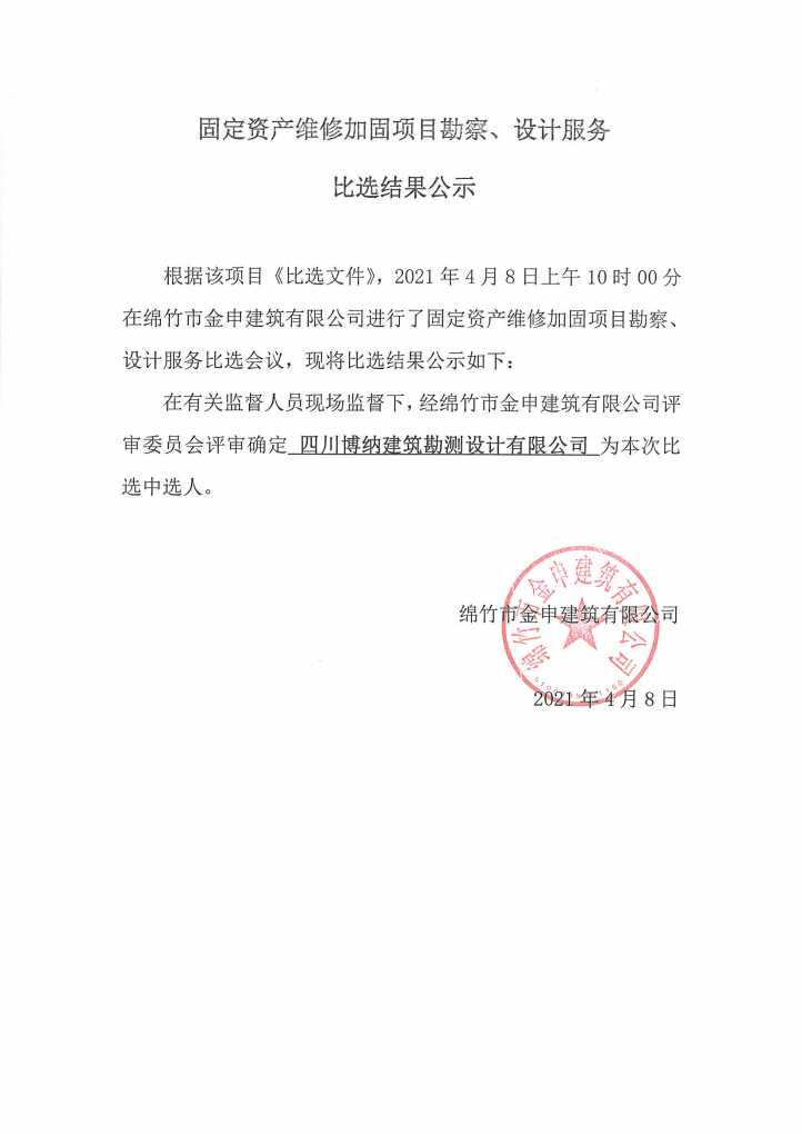 固定資產(chǎn)維修加固項目勘察、設計服務(wù)比選結果公示