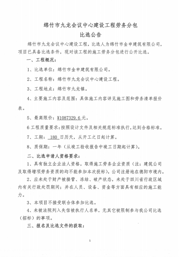 綿竹市九龍會(huì )議中心建設工程勞務(wù)分包比選公告