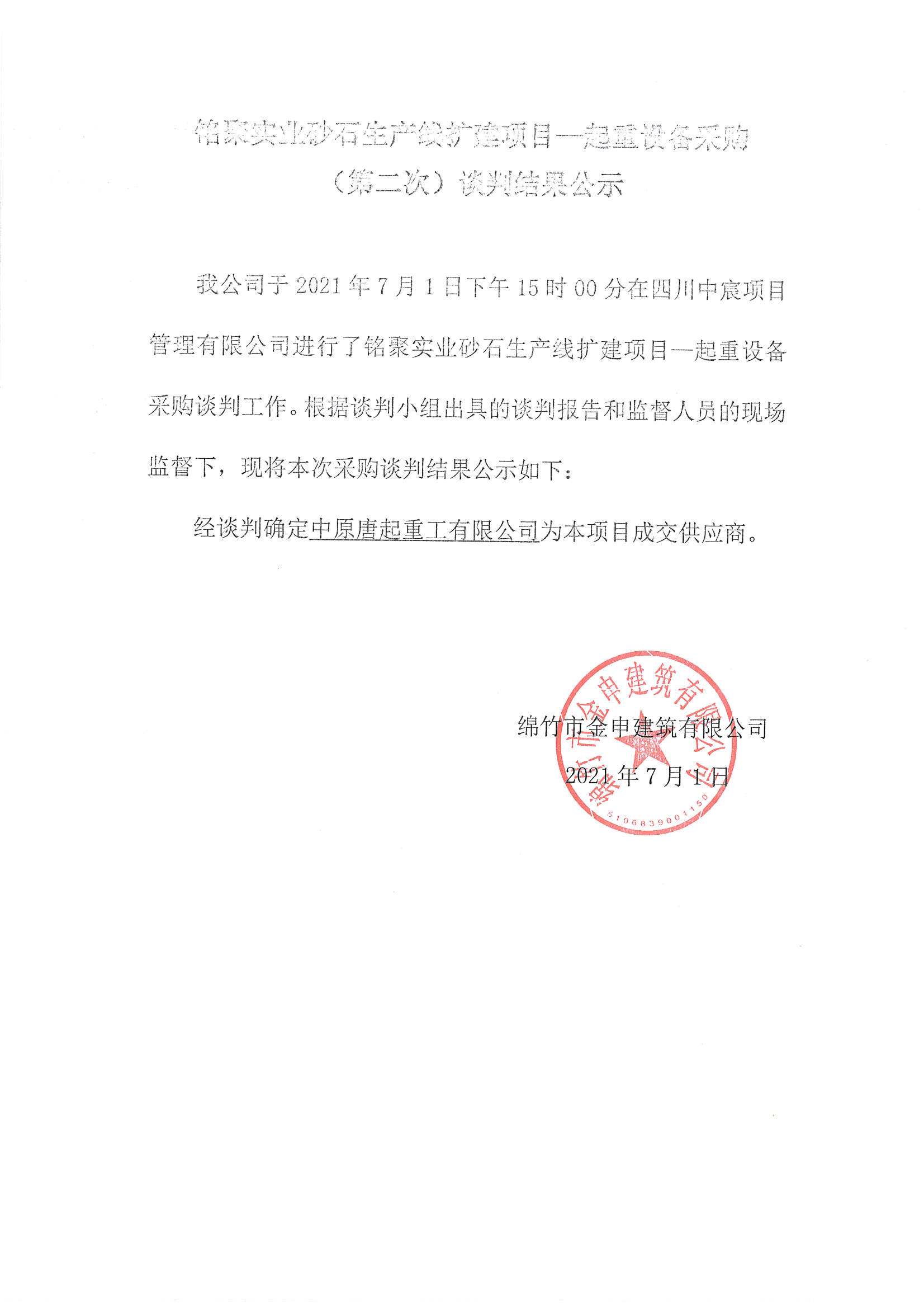 銘聚實(shí)業(yè)砂石生產(chǎn)線(xiàn)擴建項目起重設備采購談判結果公示