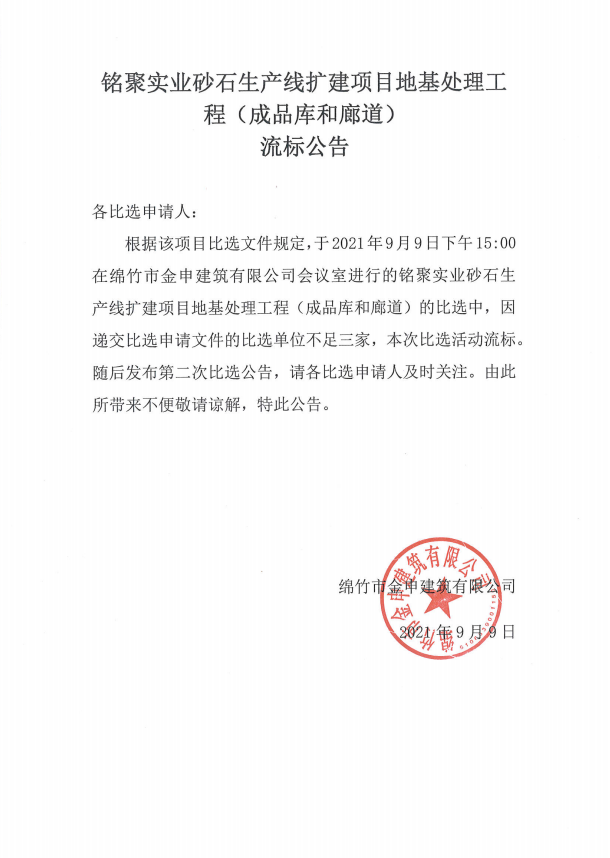 銘聚實(shí)業(yè)砂石生產(chǎn)線(xiàn)擴建項目地基處理工程流標公示