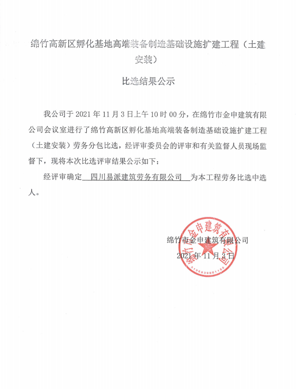 孵化基地裝備制造基礎設施擴建工程(土建)比選結果公示