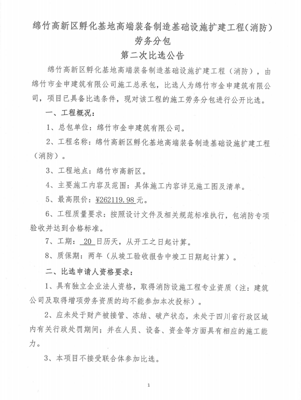 高端裝備制造基礎設施(消防)勞務(wù)分包二次比選公告