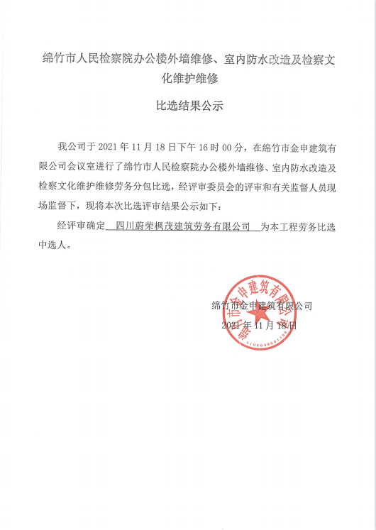 檢察院辦公樓外墻維修、室內防水改造等工程比選結果公示