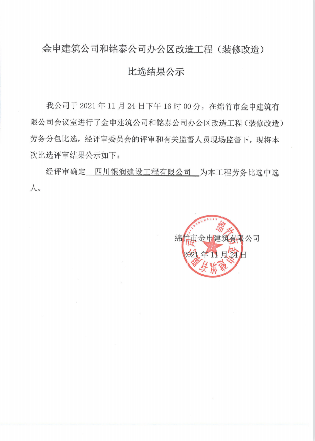 建筑、銘泰公司辦公區改造工程比選結果公示
