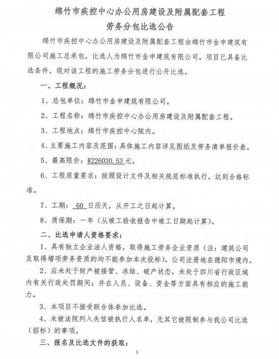 市疾控中心辦公用房建設及附屬配套工程勞務(wù)分包比選公告