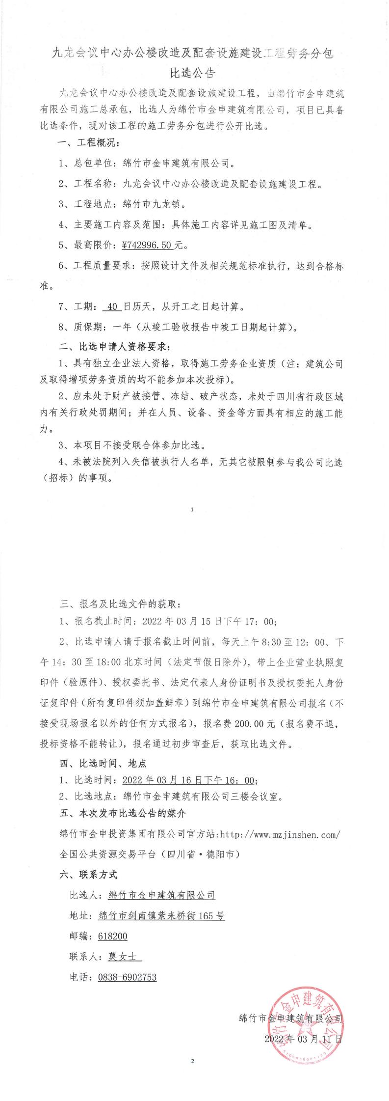 九龍會(huì )議中心辦公樓改造及配套設施建設工程比選公告