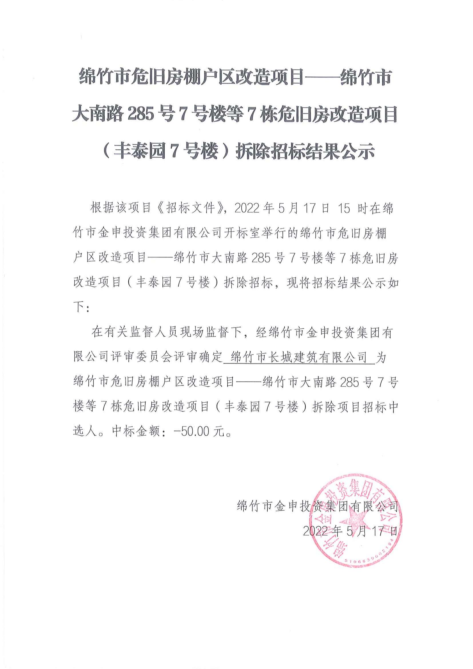 綿竹市大南路285號7號樓等7棟危舊樓房改造拆除招標結果公示