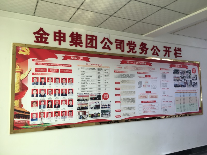 6月21日,簇新的黨務(wù)宣傳欄被安裝到金申集團公司辦公大樓,這是金申集團公司牢牢把握黨對國有企業(yè)絕對領(lǐng)導的政治要求,全面加強黨建工作的具體體現。金申集團公司黨委高度重視黨建工作,定期召開(kāi)會(huì )議研究如何加強公司的黨建工作。此次安裝的黨務(wù)公開(kāi)欄設置了黨務(wù)公開(kāi)、省十一次黨代會(huì )精神、精準扶貧等欄目,內容貼近職工群眾,語(yǔ)言樸實(shí)無(wú)華,公示信息完整,受到企業(yè)黨組織和職工群眾的熱烈歡迎,成為金申集團黨組織的一個(gè)宣傳陣地。